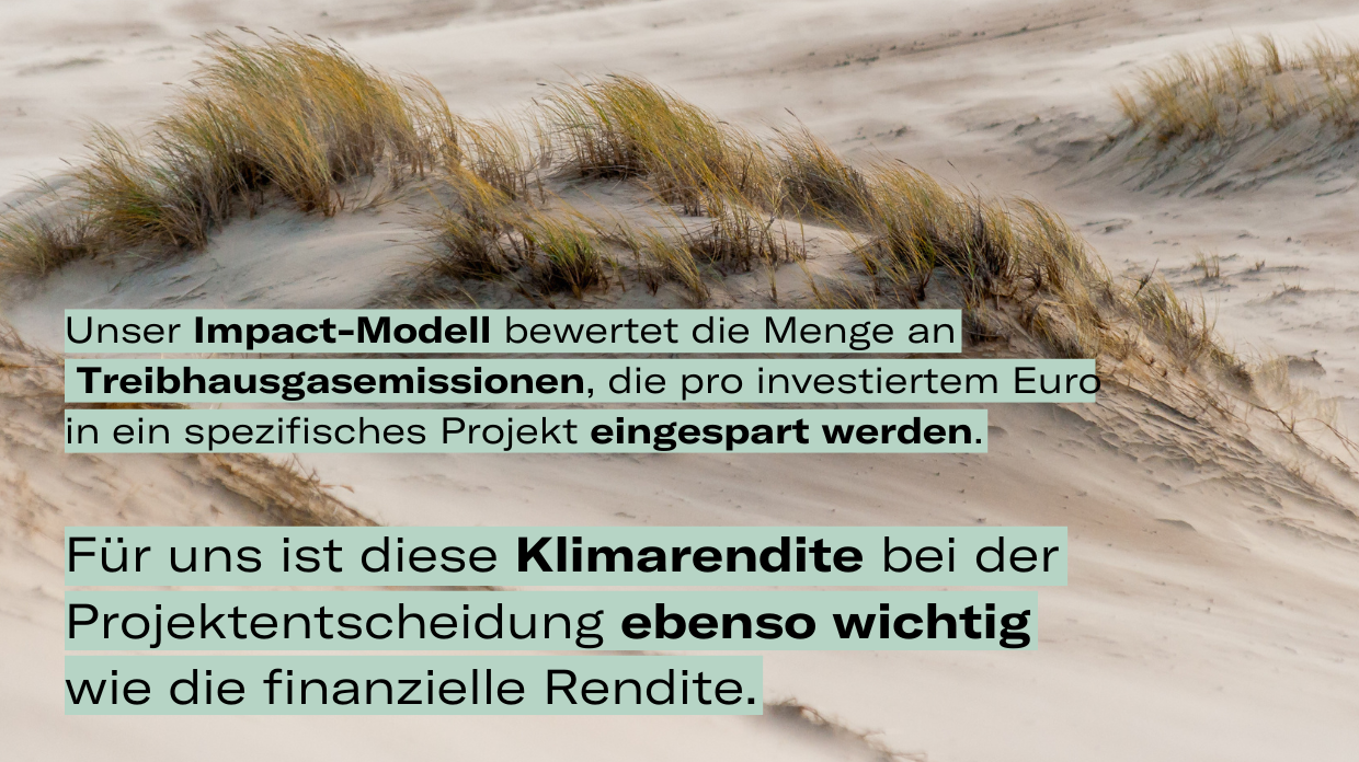 Our investments underscore our commitment to sustainable and future-oriented solutions with measurable results. We calculate the environmental success of our investments using an impact model developed in-house.
